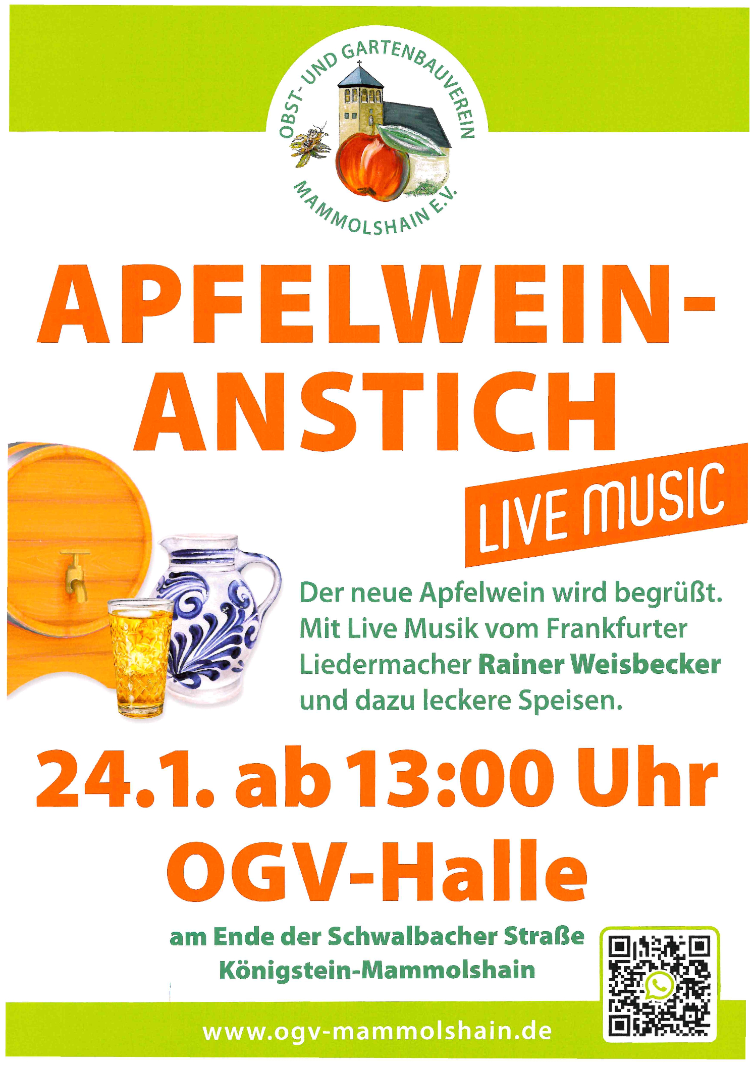 Wenn es draußen kalt und ungemütlich ist, ist der Apfelweinanstich in der beheizten OGV-Halle am Ende der Schwalbacher Straße die beste Art, den Samstagnachmittag zu verbringen. Gegen 19 Uhr wird die Veranstaltung ausklingen. Der Eintritt ist wie immer beim OGV kostenlos.