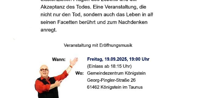 Alfred Globo Gerhards nimmt uns mit zu den existenziellen Fragen des Lebens und der Akzeptanz des Todes. Eine Veranstaltung, die nicht nur den Tod, sondern auch das Leben in all seinen Facetten berührt und zum Nachdenken anregt.