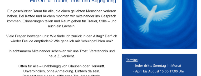 Das offene Angebot richtet sich an alle Menschen in Trauer – unabhängig von Glauben oder Herkunft. Begleitet von einer qualifizierten Trauerbegleiterin entsteht ein Raum, in dem Zuhören, Verständnis und leise Zuversicht wachsen dürfen.
