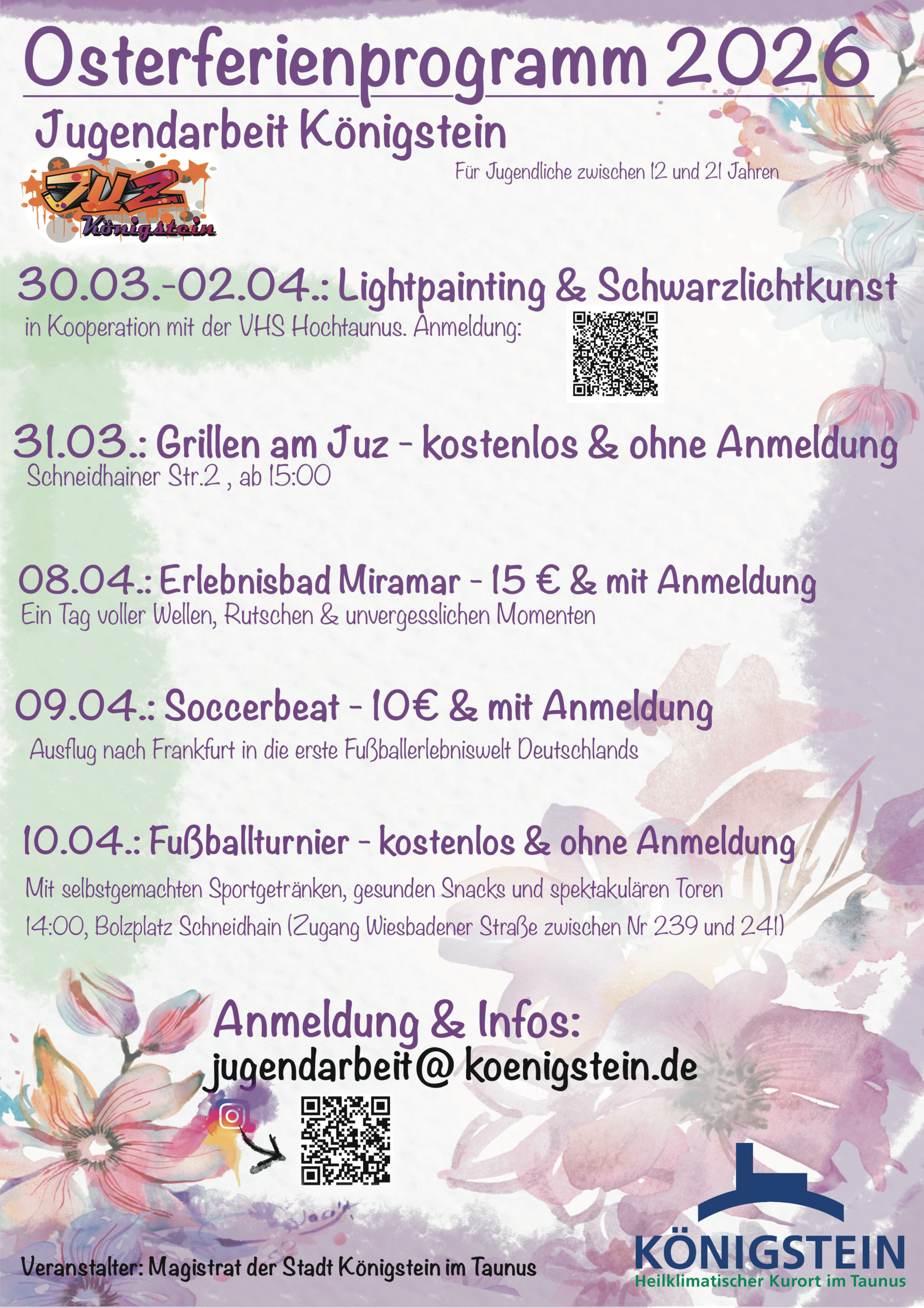 Osterferienprogramm der Jugendarbeit Königstein Ausflug mit dem JUZ-Team in das "Erlebnisbad Miramar" - genießt einen Tag voller Wellen, Rutschen und unvergesslicher Momente. Für Jugendliche zwischen 12 und 21 Jahren Treffpunkt […]