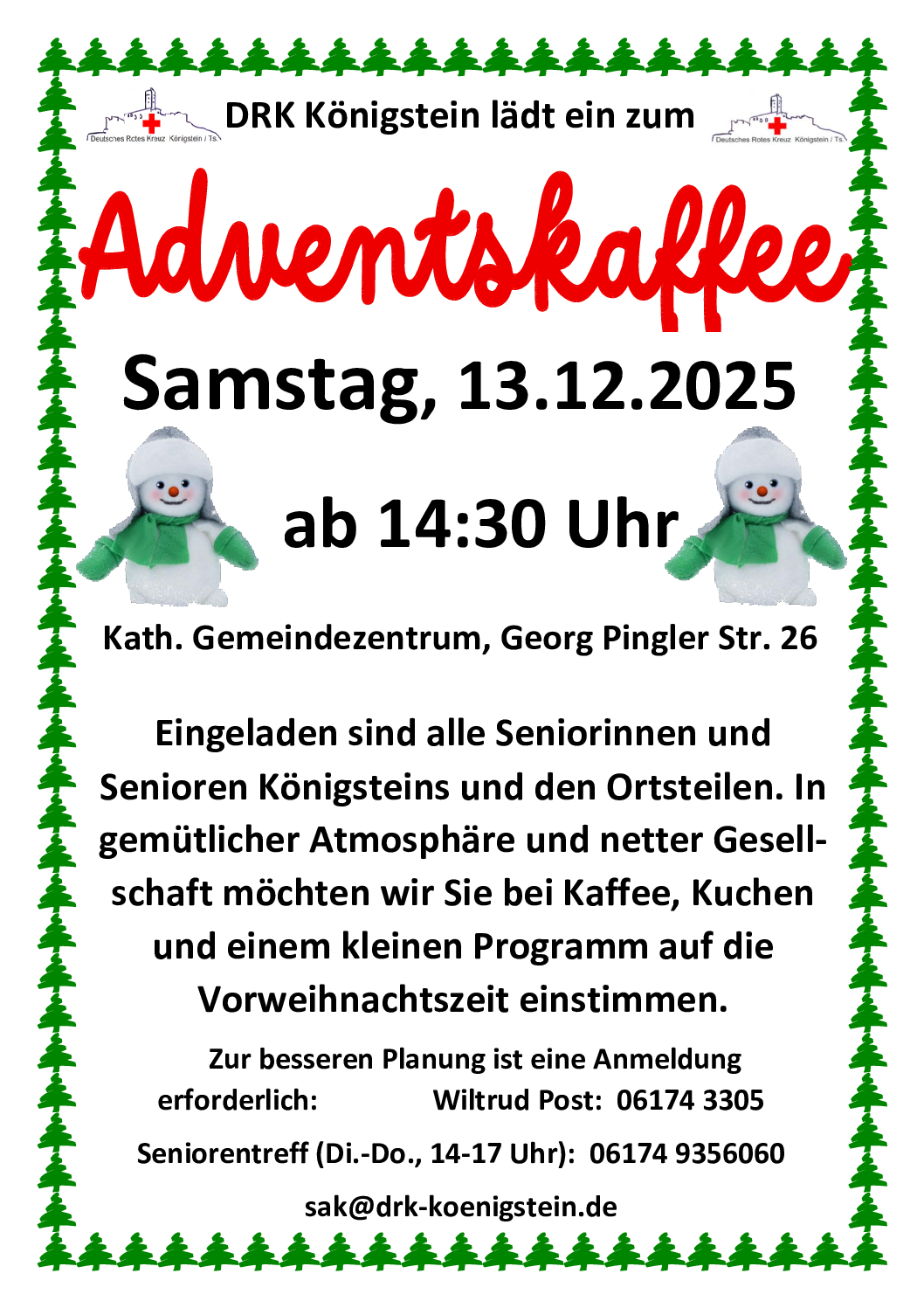 Herzliche Einladung an alle Seniorinnen und Senioren aus Königstein und den Stadtteilen zu einem unterhaltsamen, vorweihnachtlichen Kaffeenachmittag. Die Teilnahme ist kostenfrei. Plakat: Wurde von DRK Königstein zur Verfügung […]