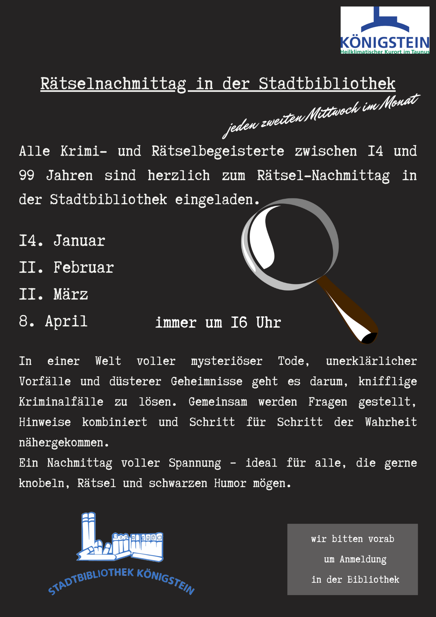 Alle Krimi- und Rätselbegeisterten ab 14 Jahren sind herzlich zum Rätsel-Nachmittag in der Stadtbibliothek eingeladen. In einer Welt voller mysteriösern Tode, unerklärlicher Vorfälle und düsterer Geheimnisse geht es darum, knifflige Kriminalfälle zu lösen. Gemeinsam werden Fragen gestellt, Hinweise kombiniert und Schritt für Schritt der Wahrheit nähergekommen. Ein Nachmittag voller Spannung – ideal für alle, die […]
